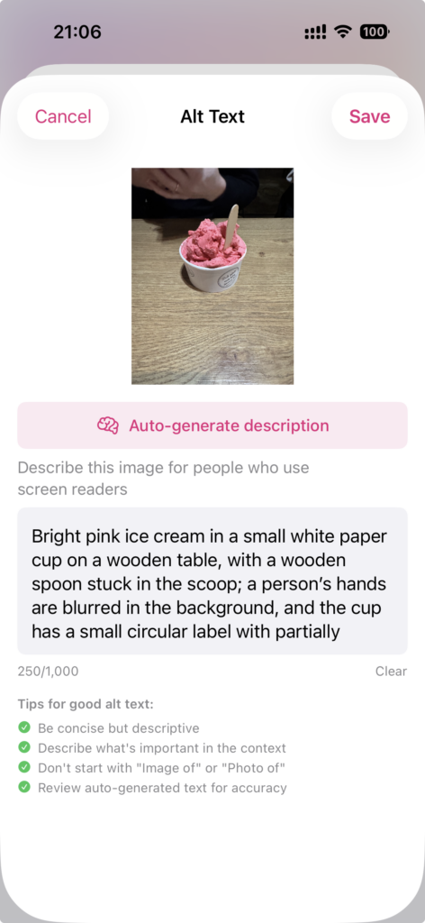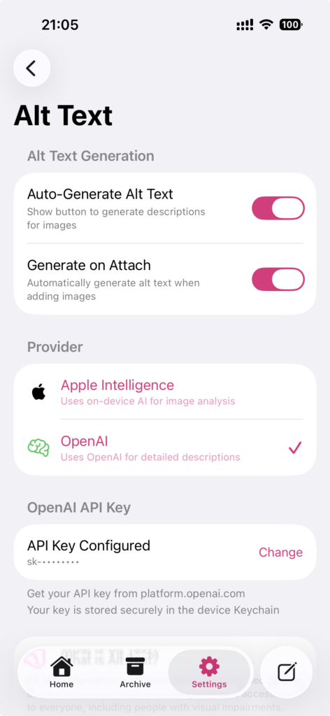• AI Alt Text: Automatic generation using OpenAI or Apple Intelligence.