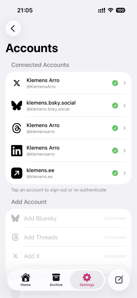 I still need to figure out how to connect Facebook. They do not allow API access for private accounts, and they really didn’t like my previous solution. That is an adventure for another day.