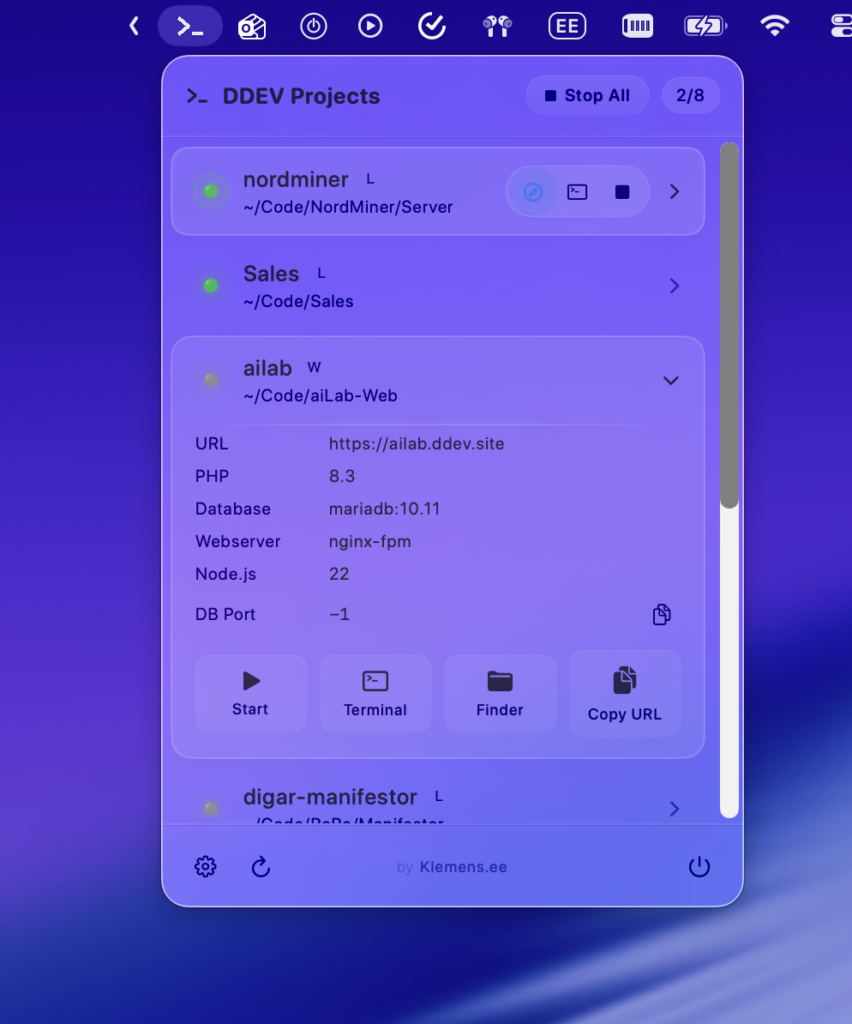 Managing DDEV projects from the terminal is fine, but constantly typing ddev list and ddev start gets old fast. I wanted a quick way to see which projects are running and control them without leaving what I’m doing.