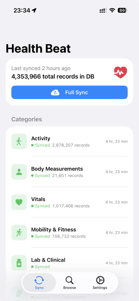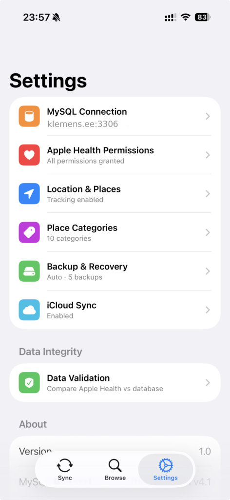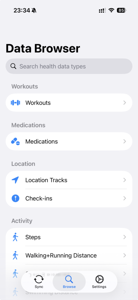 - Data Browser: Browse synced data directly in the app — quantities, workouts, sleep, categories, location tracks, and check-ins — without a database client.