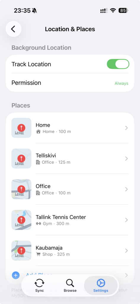 - Geofences: Define places you care about (home, office, gym, café) and HealthBeat logs every arrival and departure. Events fire even when the app isn’t running.