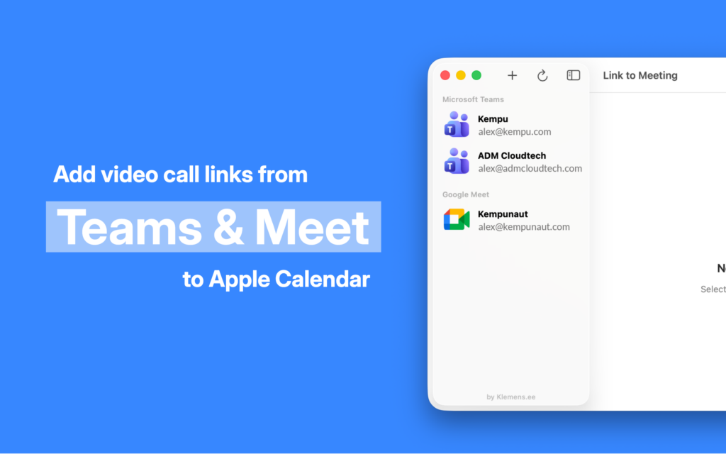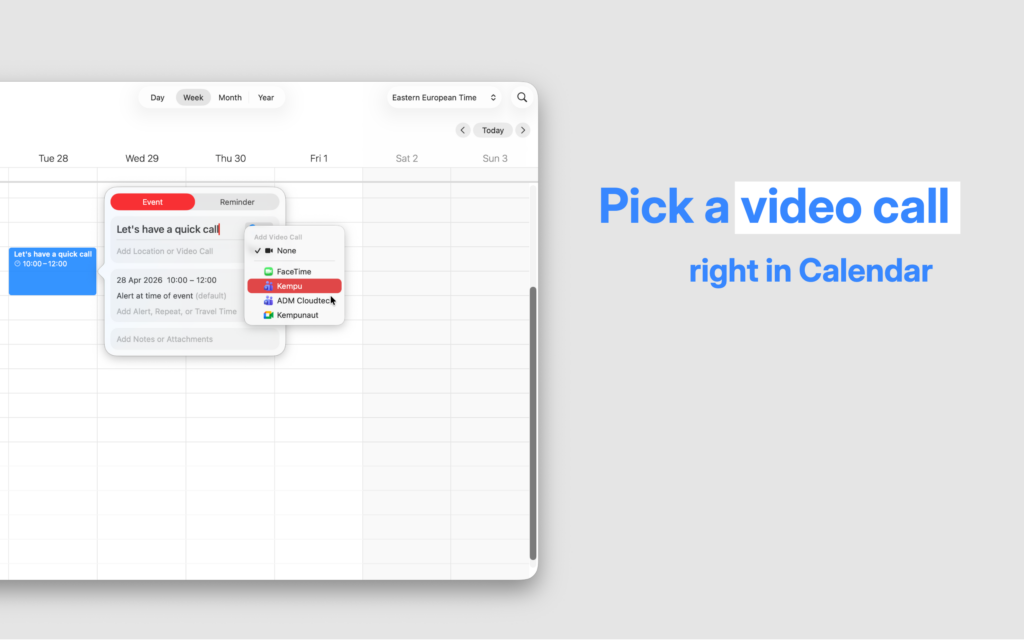 - Native Calendar Integration: Teams and Meet appear in Calendar’s built-in “Add Video Conferencing” menu. No copy-pasting, no switching apps.