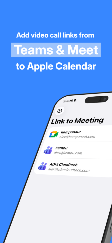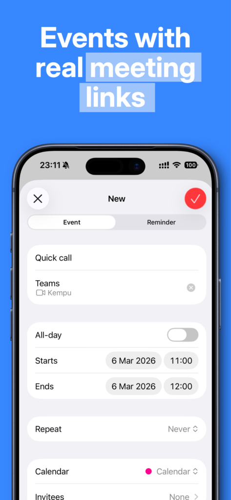 Link to Meeting fixes that. It adds Microsoft Teams and Google Meet as native conferencing options directly inside the Calendar app on iPhone, iPad, and Mac. One tap — done. A real meeting link is generated and attached to the event automatically.